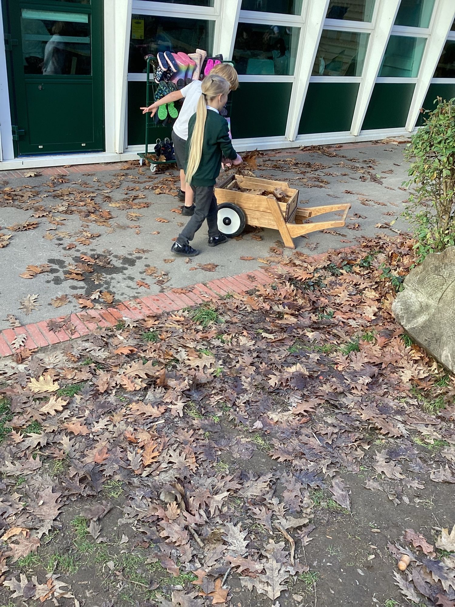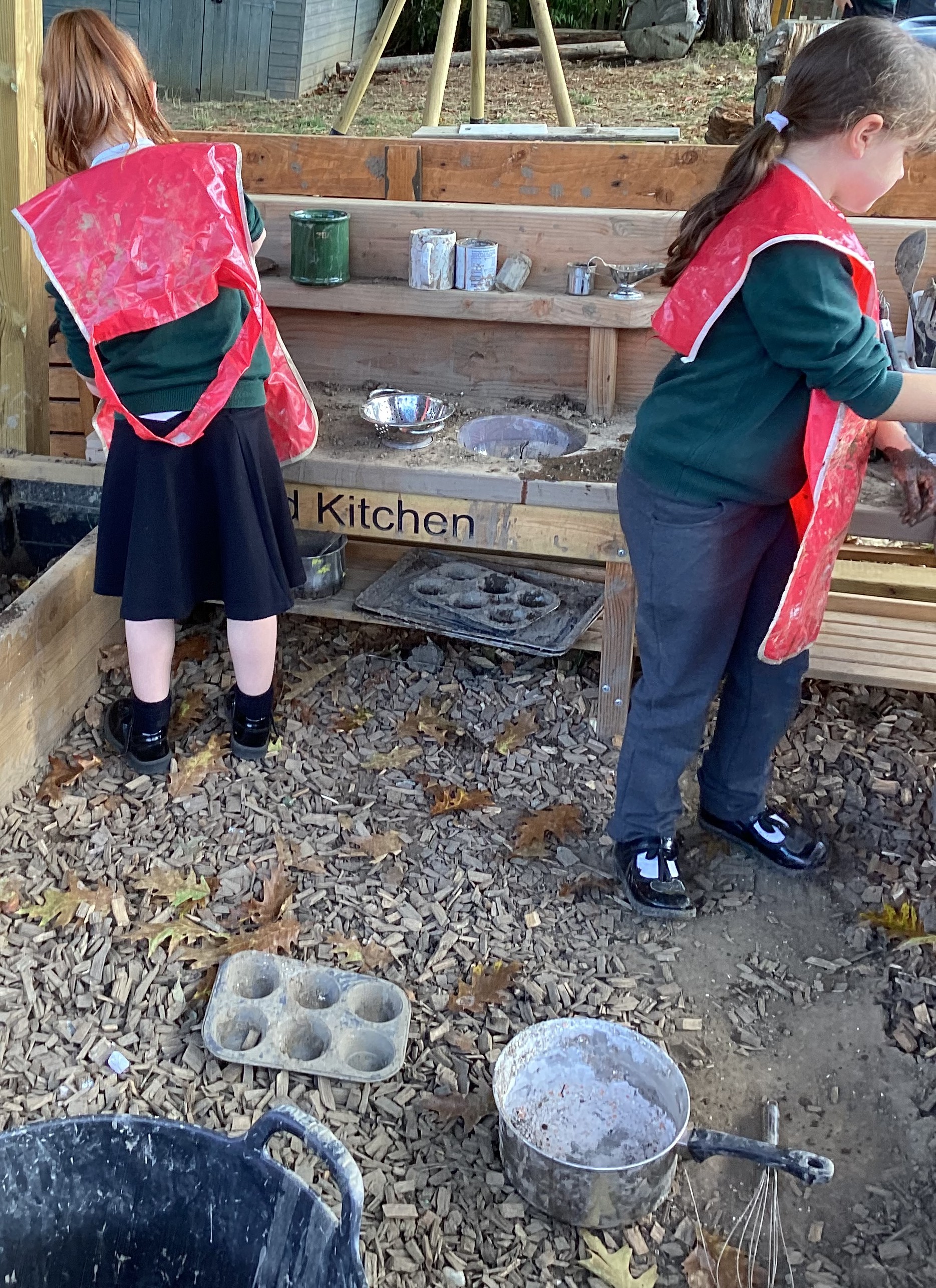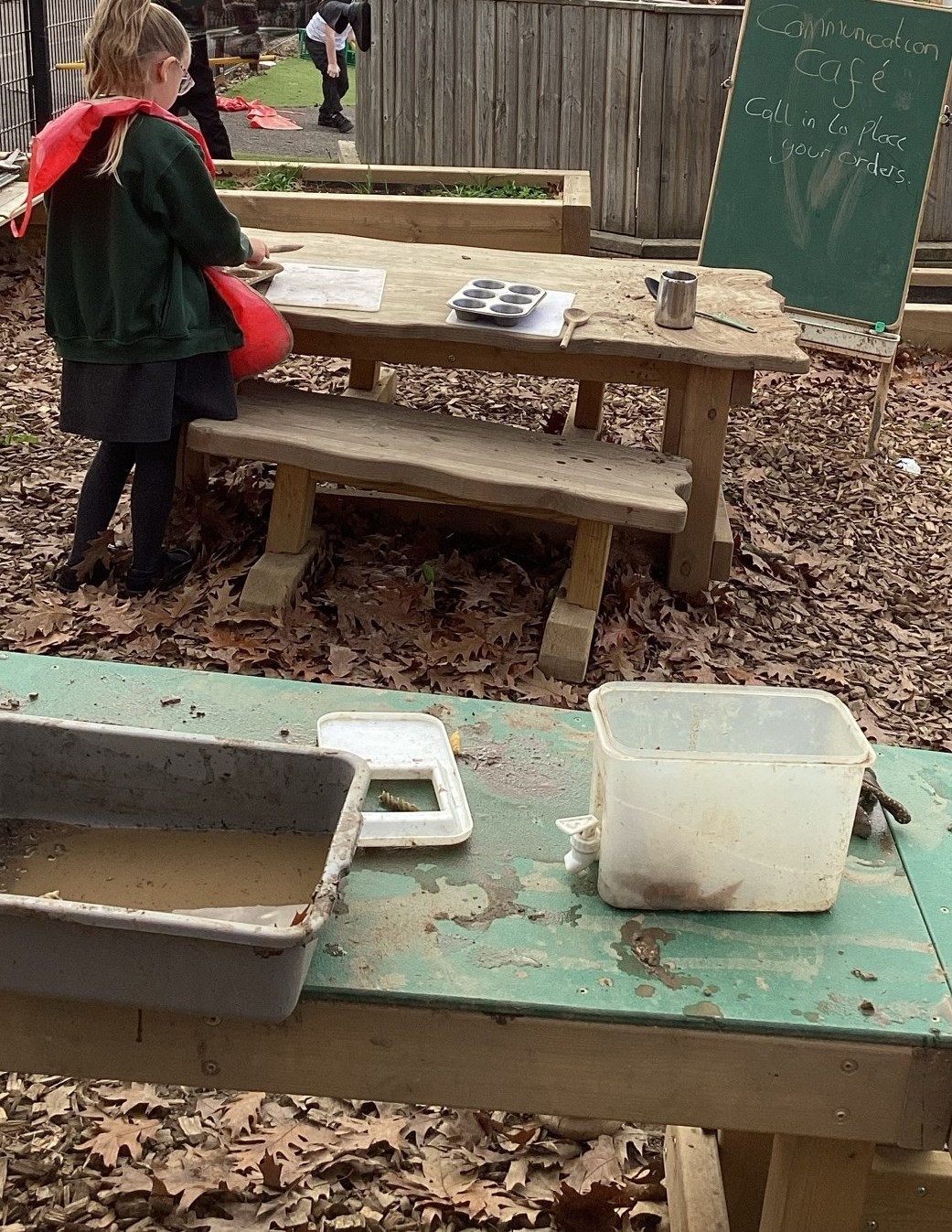 The children taking orders inside, for their café in the mud kitchen.